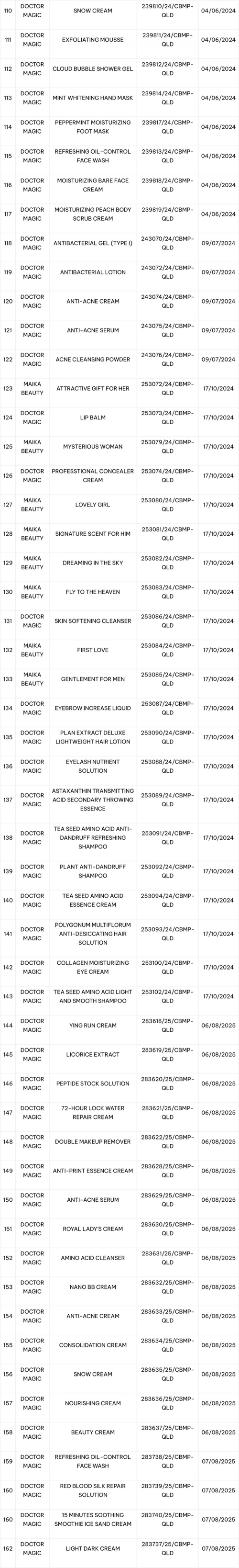 Theo danh sách này, Cục Quản lý Dược cho biết qua thống kê, từ năm 2018 đến nay, đơn vị đã cấp 162 phiếu công bố sản phẩm mỹ phẩm cho MK Skincare, trong đó phần lớn là sản phẩm dòng Doctor Magic được quảng bá là sản phẩm có xuất xứ từ Hồng Kông (Trung Quốc). Hiện 81 phiếu công bố sản phẩm mỹ phẩm còn hiệu lực.
