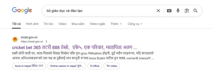 Khi người dùng gõ tìm kiếm thông tin về Bộ Giáo dục và Đào tạo trên Google thì thấy xuất hiện tên hiển thị lạ, kèm theo các chuyên mục như 'Acca in nepal', 'Kathmandu casino'...
