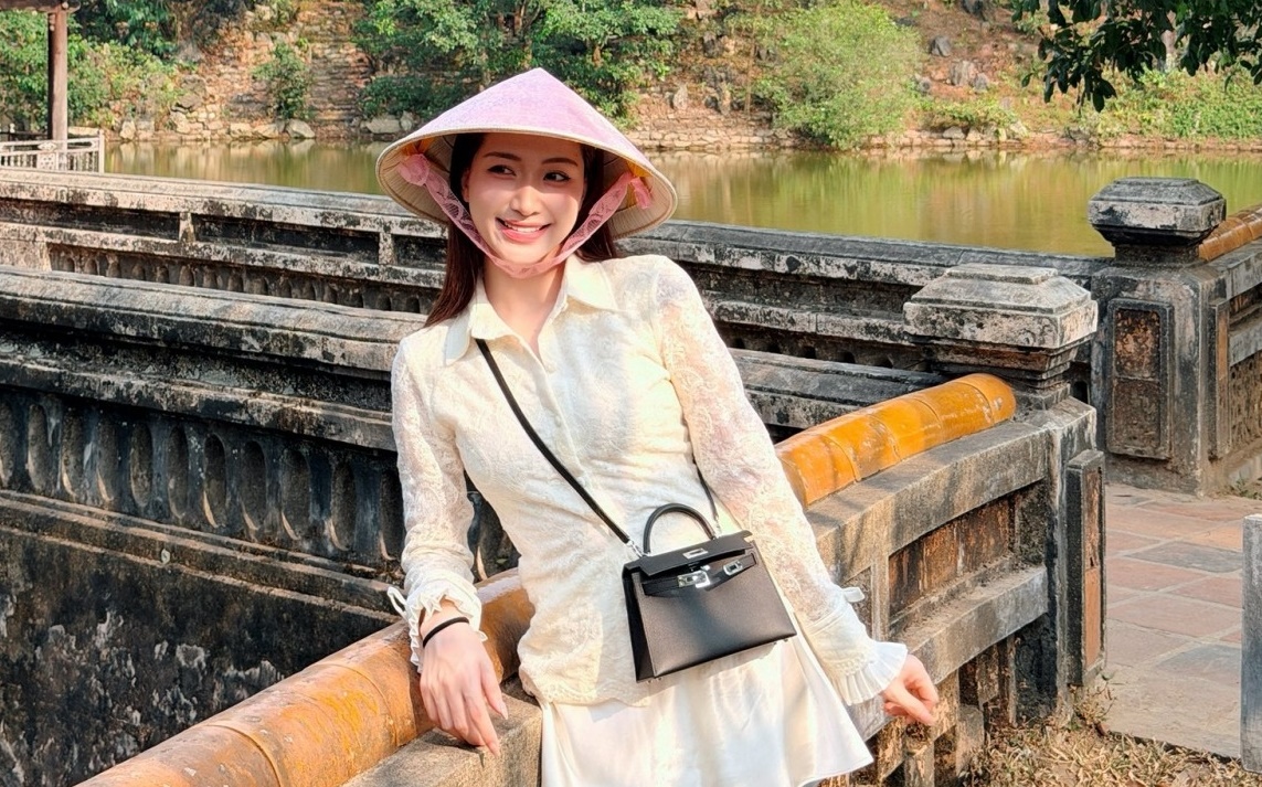 Hòa Minzy đội nón lá, diện đồ nữ tính khi cùng bé Bo và bạn trai - Đại úy Thăng Văn Cương, đến thăm các di tích lịch sử, danh lam thắng cảnh ở Huế.