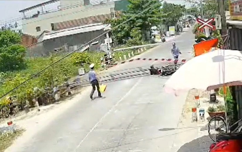Video người đàn ông điều khiển xe máy tông gãy barie đường sắt khi đang hạ