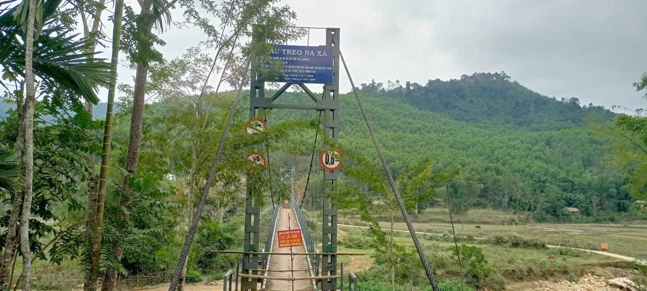 Cầu treo Na Xá, tại bản Liên Canh, xã Hùng Chân (Nghệ An), hiện đã bị dừng khai thác do tình trạng sạt lở nghiêm trọng, tiềm ẩn nguy cơ mất an toàn cho người dân và học sinh trên địa bàn.