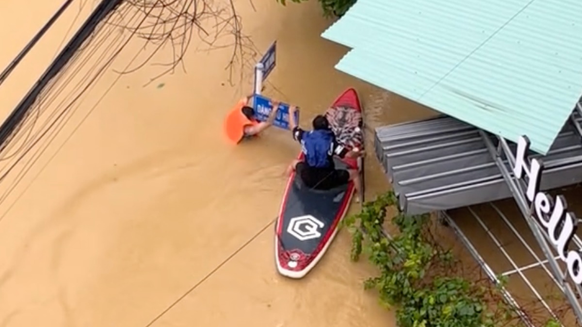 Giữa dòng nước lũ sâu gần 3 m, người đàn ông khoác vội chiếc áo mưa, chèo sup lao ra cứu thanh niên đang bám víu vào cột bảng chỉ dẫn.