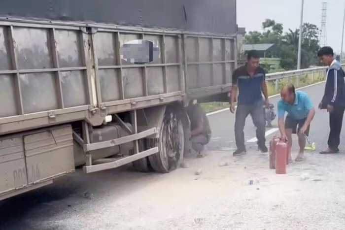 Thấy lửa phát ra từ phần lốp chiếc xe tải chạy phía trước, tài xế Hữu Cường cùng một số người trên xe khách nhanh chóng báo động, dừng lại ứng cứu.