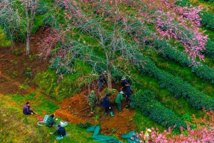Những chiếc máy xúc cùng các công nhân xuất hiện tại đồi chè Ô Long (Sa Pa) để di dời hàng trăm gốc mai anh đào. Khung cảnh này khiến nhiều du khách tiếc nuối.