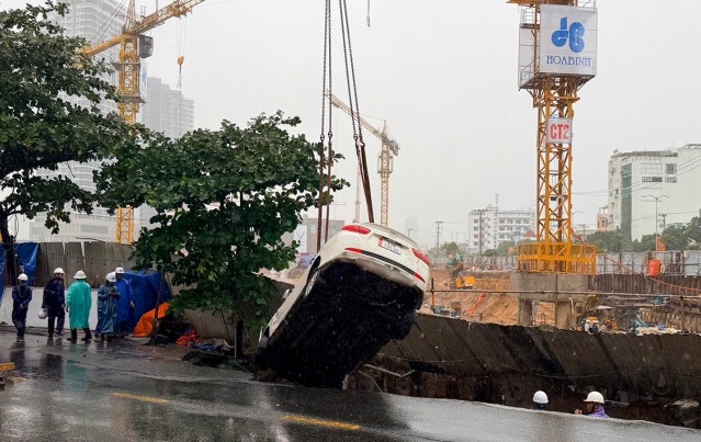 Một đoạn đường Nguyễn Công Trứ gần sông Hàn bất ngờ bị sụp, "nuốt" chửng hai ô tô đang đỗ, một công nhân bị rơi xuống hố nhưng may mắn không bị thương.