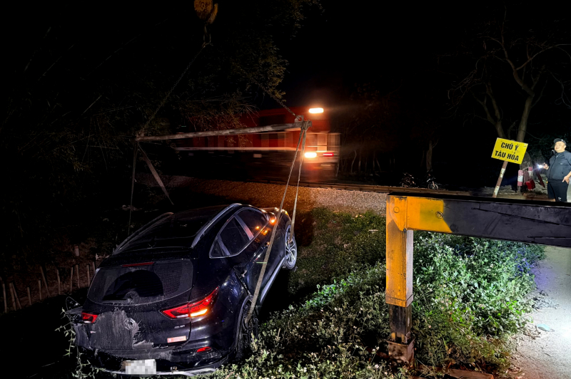 Sau va chạm với tàu hỏa, chiếc ô tô bị hất văng xuống mương nước, hư hỏng nhưng may mắn không có thiệt hại về người.