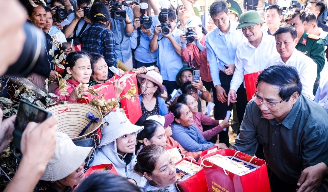 Thăm bà con bị sập nhà, tốc mái trong bão số 13 tại xã Đề Gi (Bình Định cũ, nay thuộc Gia Lai), Thủ tướng Phạm Minh Chính xúc động trước những mất mát của người dân và động viên mọi người đoàn kết vượt qua khó khăn, khắc phục hậu quả.