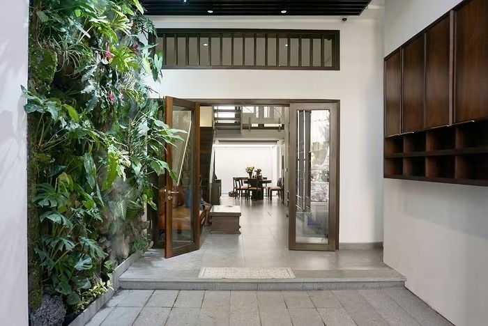 Giữa con hẻm chật chội ở TP HCM, ngôi nhà như một khoảng thở xanh mát, nơi hình ảnh tàu lá dừa Nam Bộ được tái hiện qua lam chắn và không gian lệch tầng.