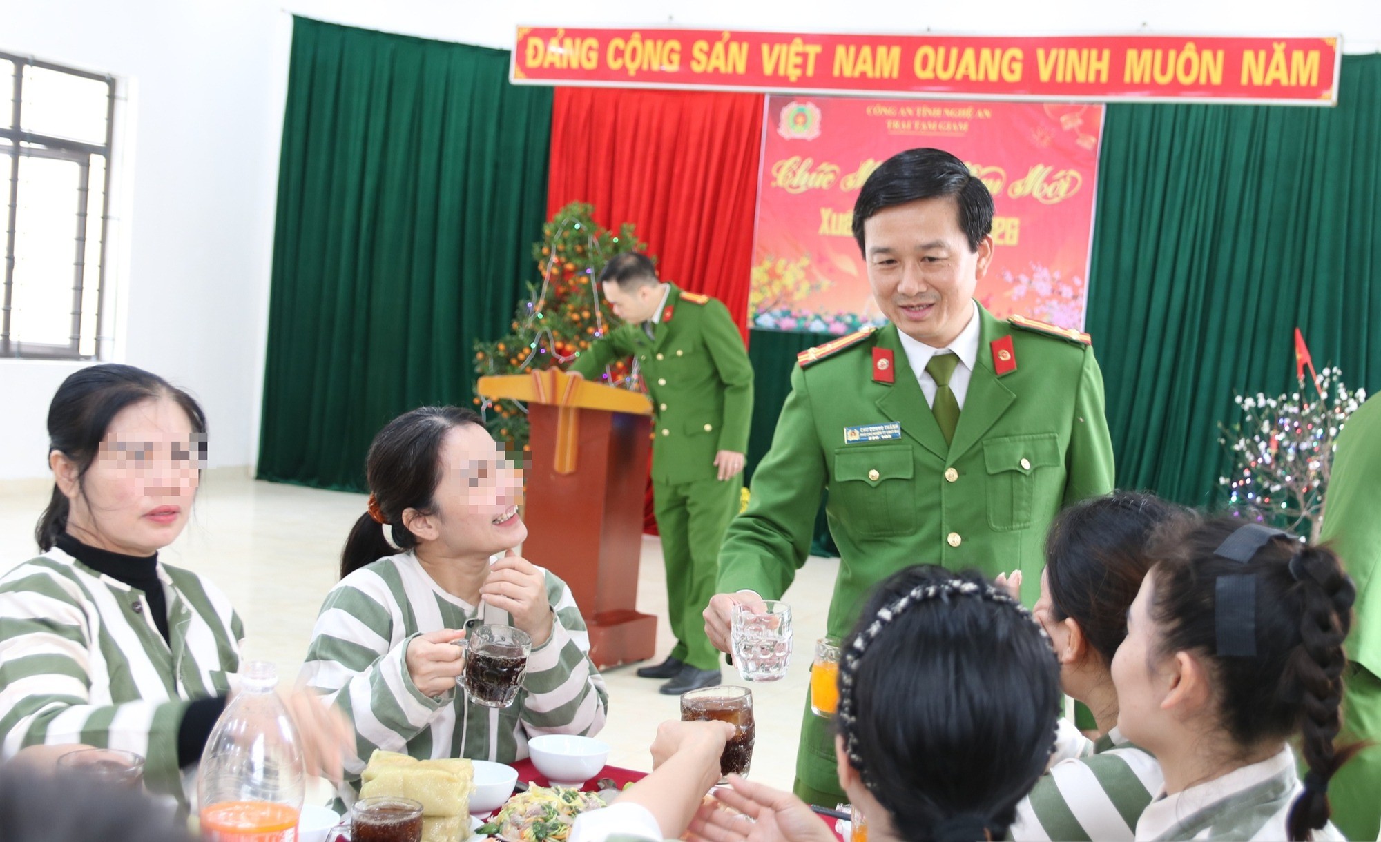 Bữa cơm tất niên dành cho các phạm nhân tại trại tạm giam Công an tỉnh Nghệ An có đầy đủ bánh chưng, thịt hộp, dưa hành, gà luộc… Đây là món quà Tết của Ban giám thị Trại tạm giam, cũng là nguồn động viên, khích lệ phạm nhân cải tạo tốt để sớm trở về sum vầy bên gia đình.
