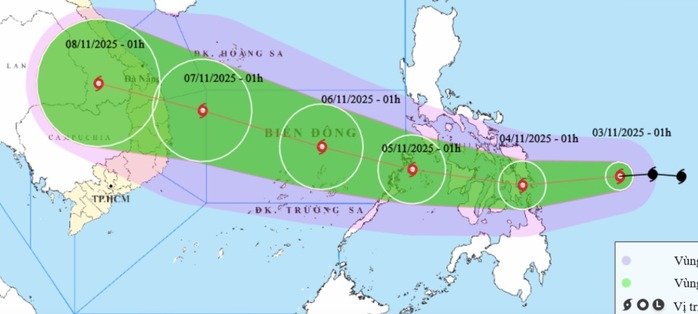 Sáng 3-11, bão Kalmaegi tiếp tục mạnh lên 2 cấp so với cuối giờ chiều qua, dự báo hướng đổ bộ vào miền Trung.