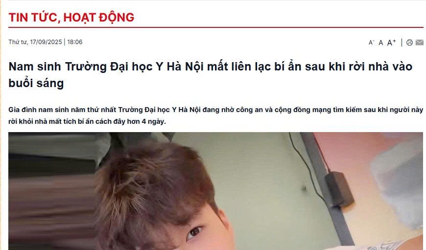 Nam sinh 18 tuổi mất liên lạc nhiều ngày, song Đại học Y Hà Nội xác nhận em không thuộc trường và đã đề nghị báo chí chỉnh lại thông tin để tránh hiểu nhầm.