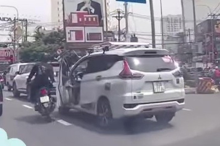 Cửa bên lái ôtô màu trắng bật mở khiến người đi xe máy bị xô ngã vào ôtô màu đen, hôm 14/3 tại đường Xô Viết Nghệ Tĩnh.