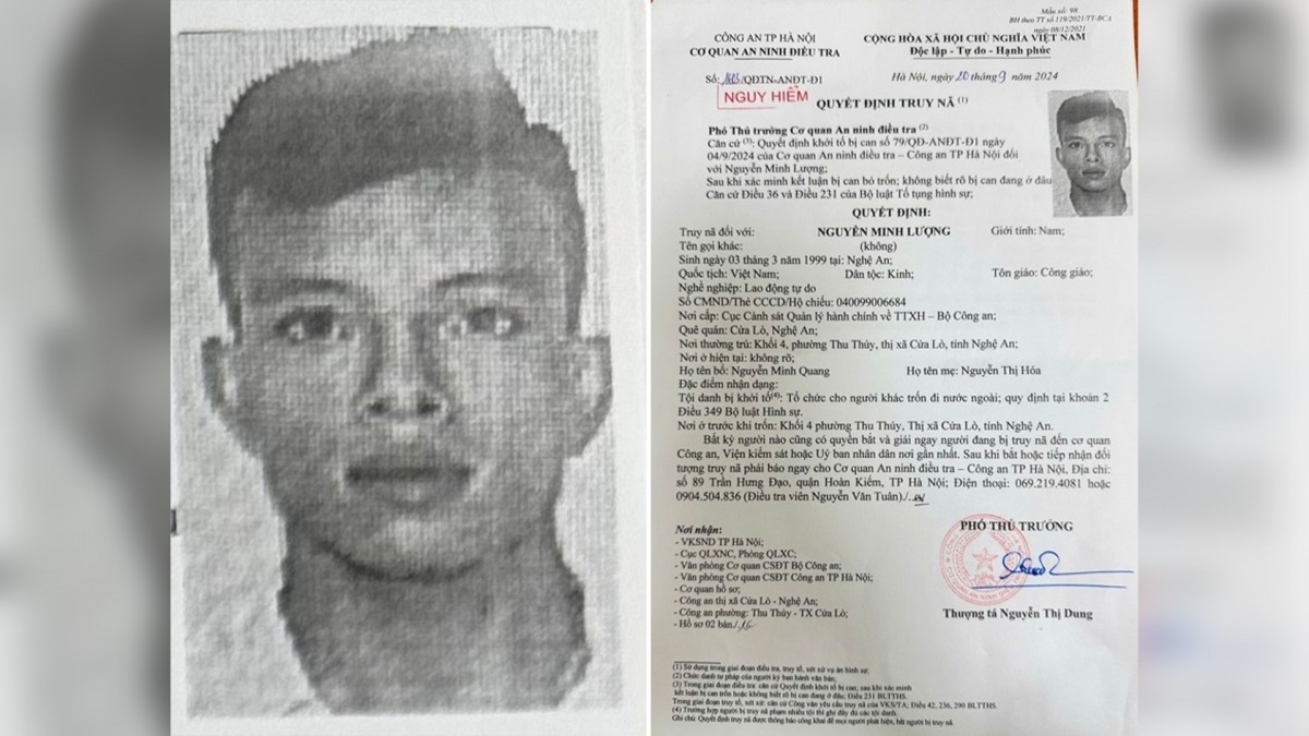 Ngày 4/2, Công an TP (CATP) Hà Nội cho biết, đang truy nã Nguyễn Minh Lượng (SN 1999, trú tại khối 4, thị xã Cửa Lò, tỉnh Nghệ An cũ) để phục vụ điều tra hành vi tổ chức cho người khác trốn đi nước ngoài trái phép.