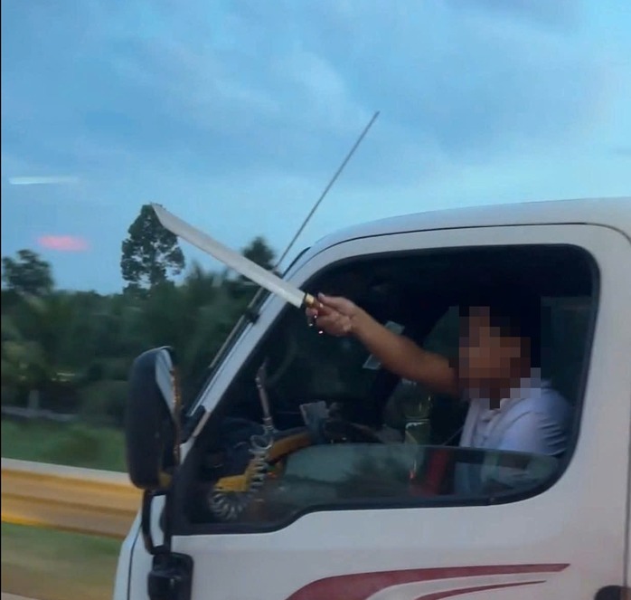 Tài xế xe tải chạy trên đường cao tốc từ Cần Thơ đi TP HCM đã thò đầu ra ngoài, cầm dao hăm doạ xe chạy song song đang quay clip.
