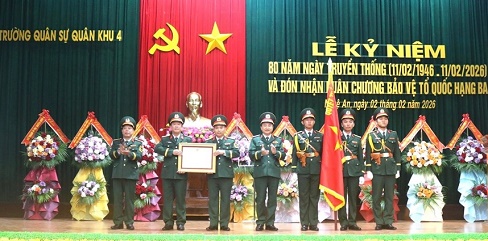 Sáng 2-2, tại Nghệ An, Trường Quân sự Quân khu 4 tổ chức Lễ kỷ niệm 80 năm Ngày truyền thống (11-2-1946 / 11-2-2026) và đón nhận Huân chương Bảo vệ Tổ quốc hạng Ba.