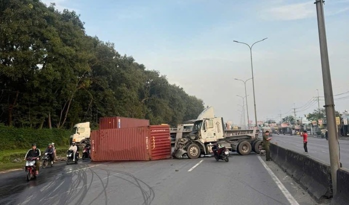 2 xe đầu kéo container va chạm trên Quốc lộ 51 (Đồng Nai) khiến 1 xe lật ngang đường, giao thông ùn ứ nhiều km vào sáng nay