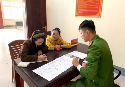 Chị Trang (áo vàng) đến Công an phường Tân Mai để trình báo và phối hợp xác minh, trả lại gần 500 triệu đồng cho chị H. |
