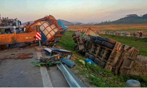 Cú tông liên hoàn tạo khói bụi mù mịt khiến xe khách găm vào đuôi xe tải Nghệ An và kẹp chặt vào dải phân cách bêtông. Xe đầu kéo Nghệ An và xe tải Thanh Hóa lật nghiêng xuống vệ đường. Hai tài xế bị thương phải đưa đi cấp cứu.