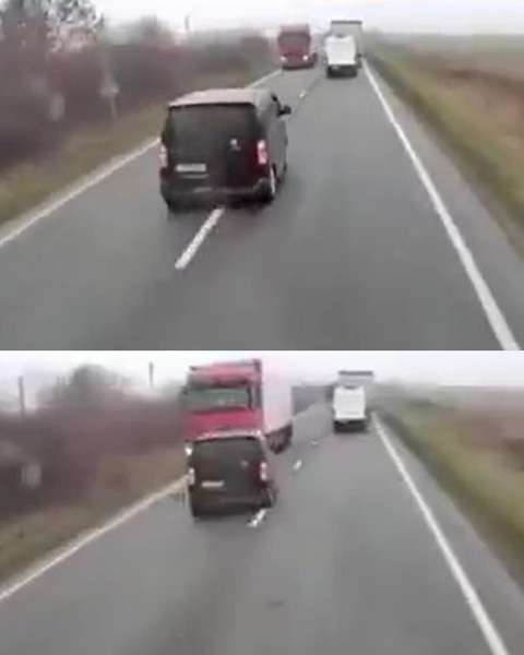 Hình ảnh chiếc minivan lấn làn và đâm trực diện xe tải màu đỏ. |