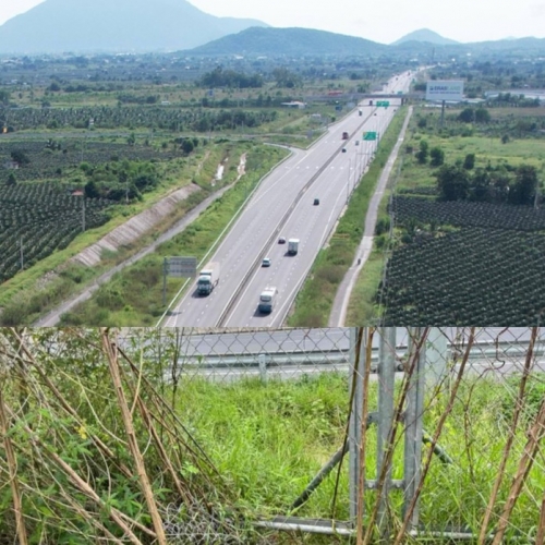 Tuyến cao tốc Vĩnh Hảo - Phan Thiết, đoạn km234 và lỗ cắt trên hàng rào bảo vệ đường cao tốc. Ảnh: DT |