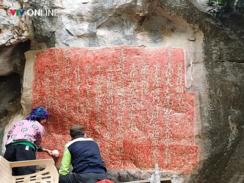 Các chuyên gia đã rập thác, ghi chép toàn bộ nội dung, hình thức và hoa văn của văn bia để phục vụ công tác số hóa, nghiên cứu và bảo tồn. Ảnh Ngọc Quân. |