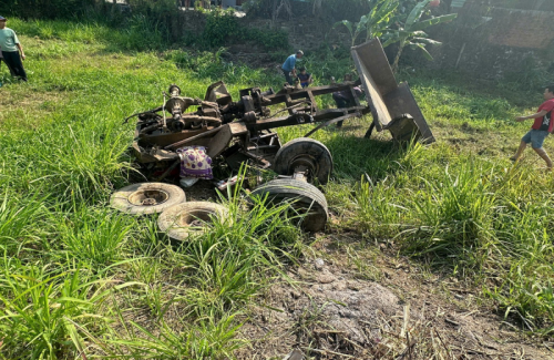 Xe công nông bi hất xuống bãi cỏ, gãy vỡ nhiều linh kiện. |