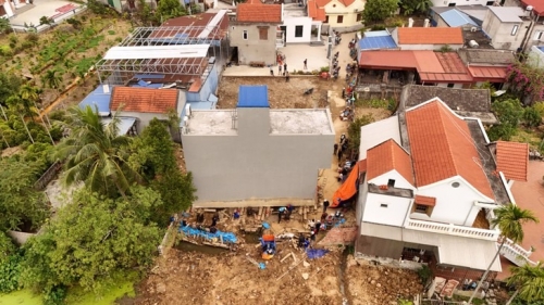 Nhóm công nhân gấp rút thi công giai đoạn cuối lắp ghép ngôi nhà với phần móng tại vị trí lô đất của gia đình ông Hữu mua ban đầu - Ảnh: CTV |