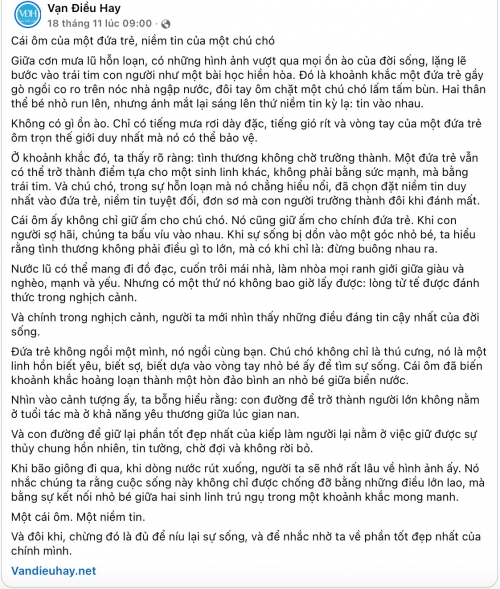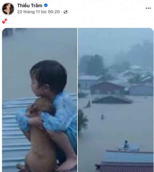 Cụ thể, vào ngày 22/11, nữ ca sĩ chia sẻ hình ảnh một em bé ôm chặt chú chó giữa dòng nước lũ và những ngôi nhà ngập đến nóc. Đính kèm là bài đăng từ một trang có gần 1 triệu người theo dõi, nội dung là cảm xúc về việc dù nghịch cảnh nhưng con người vẫn không bỏ lại thú cưng. Bài viết này thu hút hàng chục nghìn lượt tương tác vì gợi lên sự xót xa và tình người giữa thiên tai.