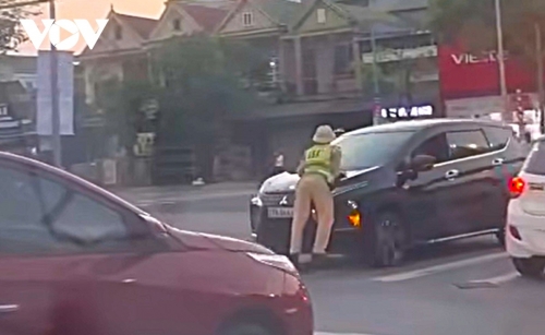 Cán bộ CSGT trên nắp capo xe ô tô. Ảnh: Cắt video |