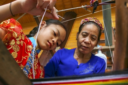 Bà Lô Thị Lan đang hướng dẫn cho cháu gái dệt vải thổ cẩm. |