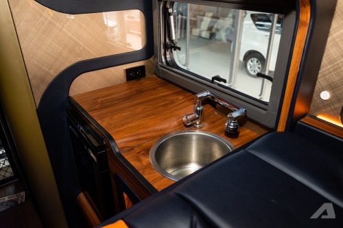 Hệ thống nước gồm bồn chứa nước sạch dung tích 200 lít bằng inox 304, bơm nước điện 12 V và đồng hồ đo mực nước. Khu bếp được trang bị bồn rửa inox.