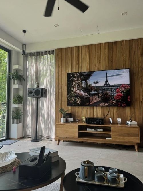 Biệt thự của vợ chồng Văn Lâm có thiết kế mở với phòng khách thông tầng, ba mặt kính. Đôi trẻ trang trí không gian này theo phong cách Bắc Âu, ưu tiên nội thất gỗ |