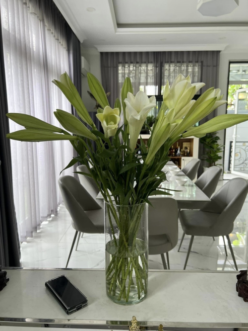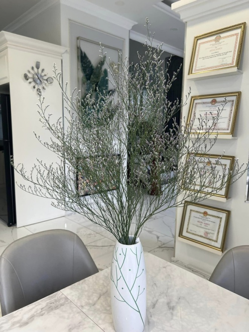Không chỉ chú trọng kiến trúc, nữ ca sĩ còn chăm chút từng góc nhỏ bằng những bình hoa tươi do chính tay mình cắt tỉa, cắm đặt. Từ phòng khách đến phòng bếp, đâu đâu cũng ngập tràn sắc hoa, mang lại cảm giác tươi mới và tràn đầy sức sống, khiến không gian sống vốn đã sang trọng càng thêm phần sinh động.