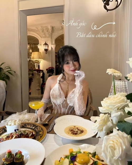 Trong bộ ảnh mới, hot TikToker xuất hiện tại một không gian nhà hàng sang trọng, lãng mạn. Cô chọn cho mình một chiếc đầm dài được làm từ chất liệu ren trắng mỏng manh, thiết kế theo phong cách xuyên thấu đầy mê hoặc.(Ảnh: IGNV) |