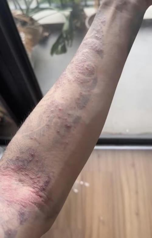 Tình trạng cánh tay của Huỳnh Khánh Đông trước và sau khi bôi thuốc, khám da liễu. |