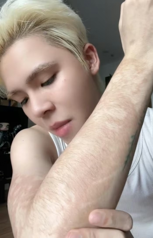 Ngày 16/10, TikToker Huỳnh Khánh Đông tiếp tục đăng tải đoạn video "cầu cứu" cộng đồng mạng về vết dị ứng trên cánh tay do hình xăm dán tạm thời từ 2 tuần trước đó.