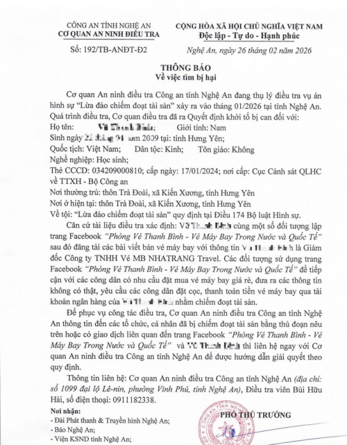 Cơ quan An ninh điều tra Công an tỉnh Nghệ An vừa phát đi thông báo lần 2 về việc tìm bị hại liên quan đến vụ án "Lừa đảo chiếm đoạt tài sản" xảy ra trên địa bàn tỉnh vào tháng 1-2026.