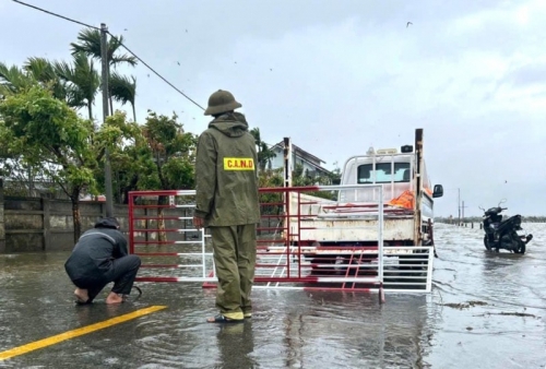 Công an phường Kim Trà (TP Huế) túc trực, chốt chặn tại các tuyến đường ngập lụt sâu để đảm bảo an toàn. |