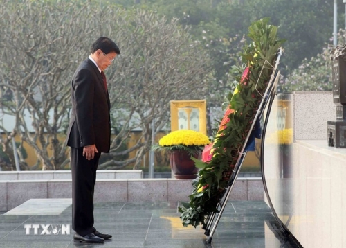 Tổng Bí thư, Chủ tịch nước Lào Thongloun Sisoulith và Phu nhân cùng Đoàn đại biểu cấp cao Đảng, Nhà nước Lào đã tới đặt vòng hoa, tưởng niệm các Anh hùng liệt sĩ tại Đài Tưởng niệm các Anh hùng liệt sĩ. Ảnh: TTXVN |
