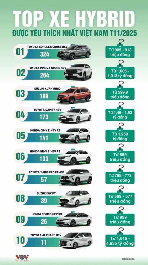 Theo báo cáo của Hiệp hội các nhà sản xuất ô tô Việt Nam (VAMA), Top xe hybrid được yêu thích nhất thị trường Việt Nam tháng 11/2025 có tới 5 mẫu thuộc thương hiệu Toyota và còn lại là các thương hiệu khác cũng đến từ Nhật Bản.
