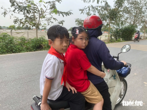 Một phụ huynh có con học Trường tiểu học Yên Thường quyết định cho con dừng ăn bán trú. Trong hình, vị phụ huynh này chở con và cháu về nhà sau giờ học buổi sáng - Ảnh: NGUYÊN BẢO |