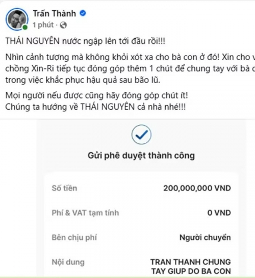 Trấn Thành - Hari Won ủng hộ 200 triệu đồng cho bà con Thái Nguyên. Ảnh: FB Trấn Thành. |