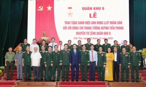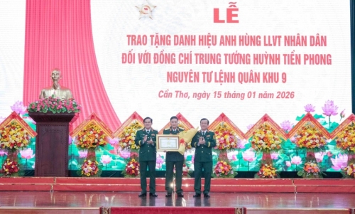 Thừa ủy quyền của lãnh đạo Đảng, Nhà nước, Quân ủy Trung ương, Bộ Quốc phòng, lãnh đạo QK 9 trao tặng danh hiệu Anh hùng LLVTND đối với Trung tướng Huỳnh Tiền Phong, nguyên Tư lệnh QK9. |