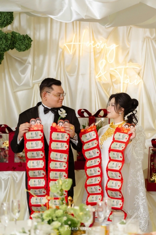 "Thực tế, gia đình nhà trai đã chuẩn bị đầy đủ sính lễ theo truyền thống", Hương nói. Những mâm lễ gồm trầu cau, rượu, bánh, sâm, tổ yến, trái cây - các sản phẩm được đầu tư chỉn chu, có cả hoa và trái cây nhập khẩu.