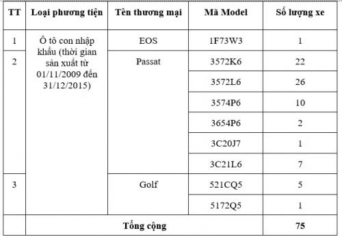 Chương trình triệu hồi được thực hiện để kiểm tra và thay thế linh kiện túi khí TAKATA trên vô lăng lái ở một số mẫu xe Volkswagen EOS, Passat, Golf được sản xuất từ năm 2009 đến 2015 do Công ty TNHH Ô tô Thế Giới nhập khẩu và phân phối theo chương trình triệu hồi số 69EJ của hãng Volkswagen AG.