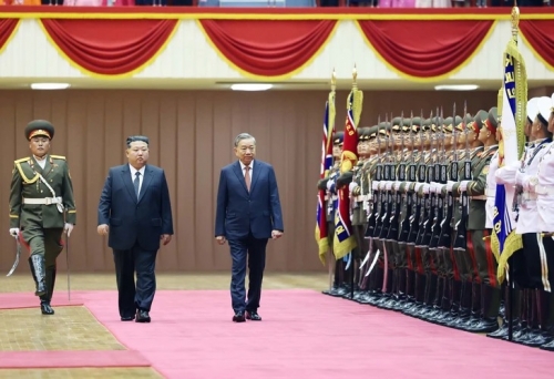 Lễ đón chính thức Tổng Bí thư Tô Lâm được Triều Tiên tổ chức trọng thể tại Cung Thể thao Bình Nhưỡng, dưới sự chủ trì của Tổng Bí thư Đảng Lao động Triều Tiên, Chủ tịch Quốc vụ nước Cộng hòa dân chủ nhân dân Triều Tiên Kim Jong Un.