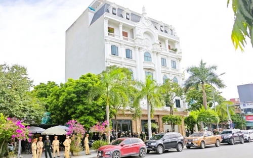 Trụ sở Công ty Bất động sản Đạt - Ý và cũng là nhà ở của Bùi Quốc Ý. Trong ảnh lực lượng công an đang thi hành khám xét ngày 15-7-2025 |