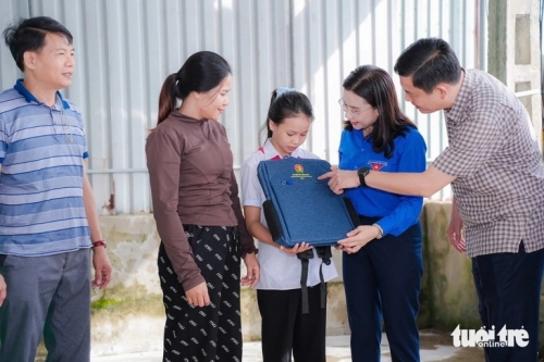 Cơn bão vừa qua đã khiến căn nhà của em bị hư hại nặng. Đoàn công tác trực tiếp ân cần thăm hỏi, trao tặng em ba lô, sách vở cùng những món quà động viên tinh thần, giúp em thêm nghị lực vượt qua khó khăn.
