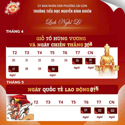 Học sinh sẽ nghỉ ngày 25 (thứ 7), 26 (chủ nhật) và 27-4 (thứ 2). Sau đó đi học bình thường các ngày 28 và 29-4 rồi tiếp tục nghỉ các ngày 1, 2, 3-5 (nhằm ngày thứ 6, 7, chủ nhật) |