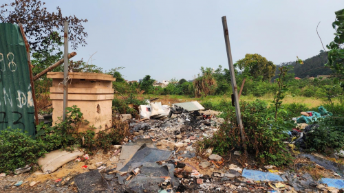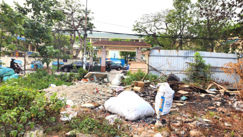 Bên trong khu đất, cây cỏ mọc um tùm, xen lẫn nhiều loại rác thải sinh hoạt và vật liệu xây dựng. Không ít khu vực rác tồn đọng lâu ngày, chất thành đống lớn, tiềm ẩn nguy cơ ô nhiễm môi trường và mất vệ sinh đô thị.